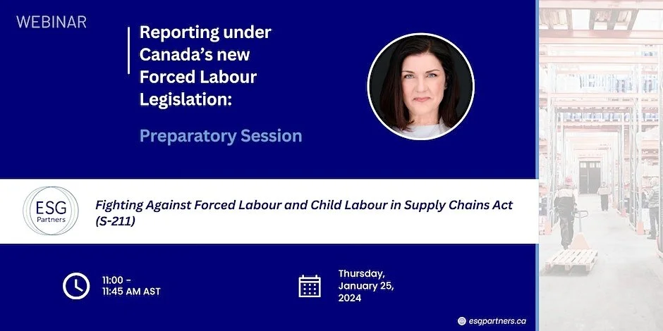 Join ESG Partners' President & Founder Nancy Foran on Thursday, January 25 for a virtual preparatory session to learn more about whether this applies to you directly or may apply indirectly through clients or business partners, and how to align procedures and reporting with mandatory elements of the Act to maintain compliance and reduce the likelihood of forced labour in your supply chain.
