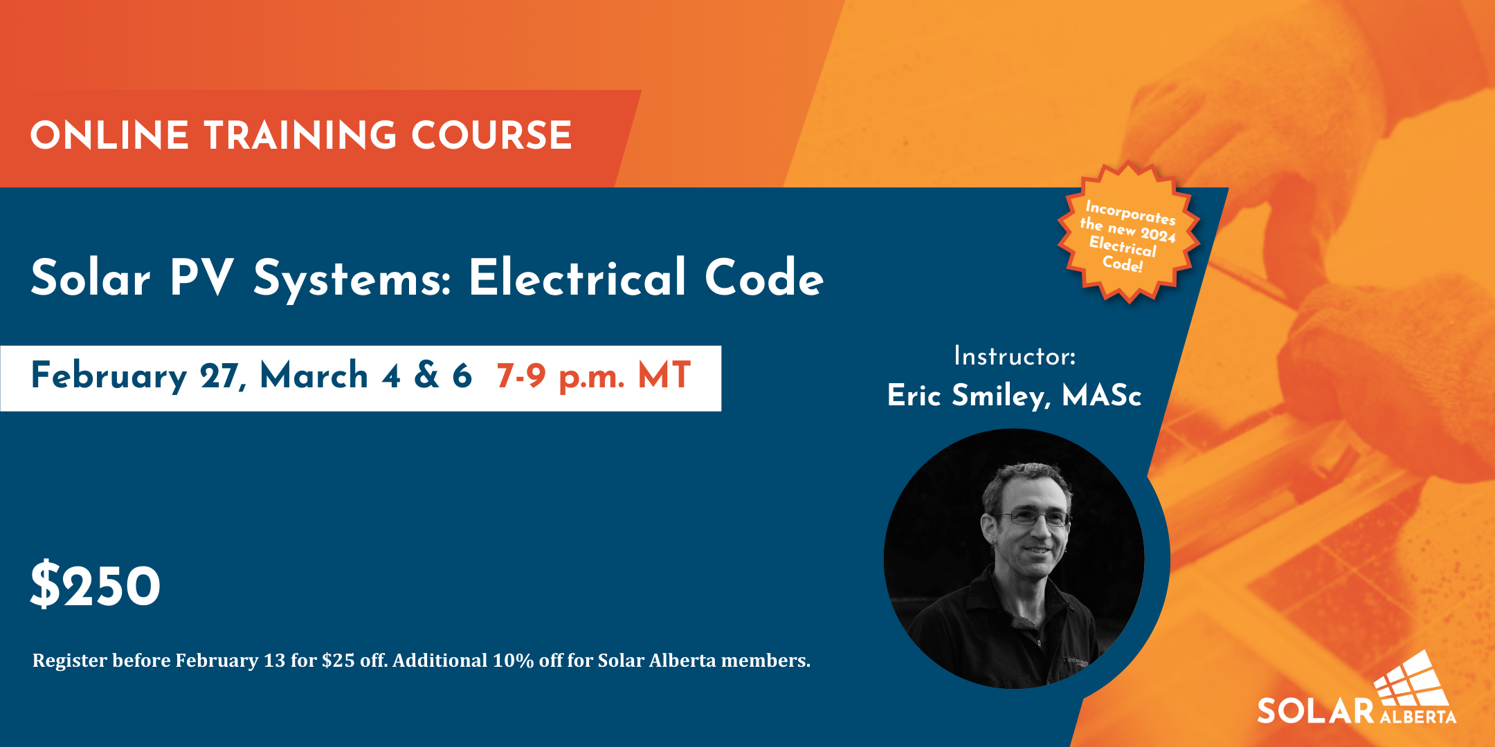 Register for this 3-night course to become familiar with the most crucial inspection points of common solar PV systems and all the updates to the new Electrical Code standards as they apply to solar photovoltaic (PV) installations. This course is intended for electricians, technicians, engineers, solar installers, sales people, and those with a good understanding of electrical theory and electrical terminology who want to ensure that their solar installations meet the current Canadian Electrical Code standards. It focuses on grid-interactive residential and commercial-scale solar PV projects less than 1 MW.