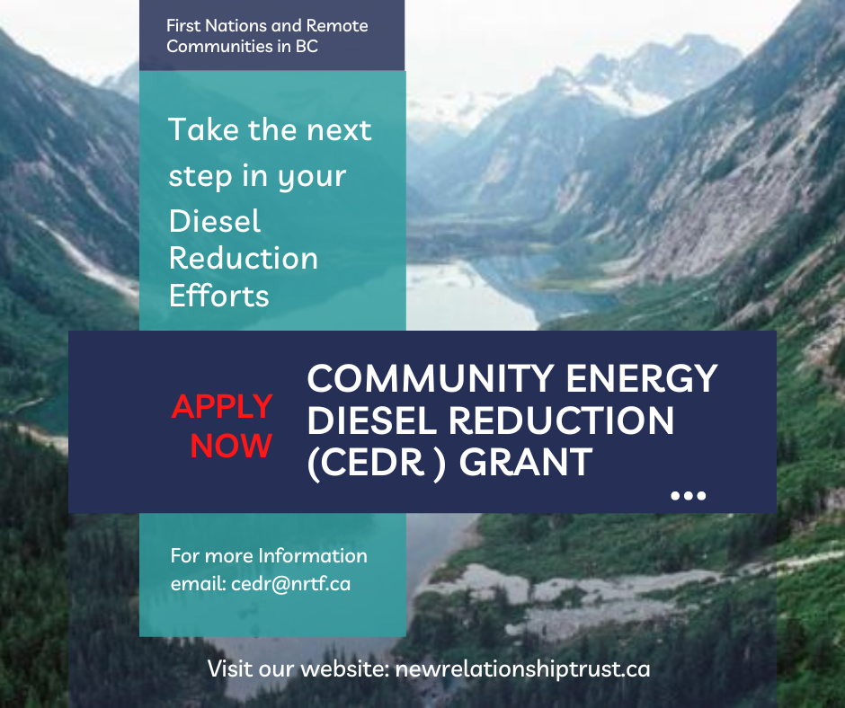 The CEDR Program was funded and developed in partnership with Coast Funds and the B.C. Ministry of Energy, Mines and Low Carbon Innovation as part of the Ministry’s remote community energy strategy to achieve the CleanBC goal of reducing diesel electricity generation and heating in remote communities by 80% by 2030. The CEDR Program will also be co-delivered by Coast Funds who will focus on supporting the eligible remote communities in the Great Bear Rainforest and Haida Gwaii.